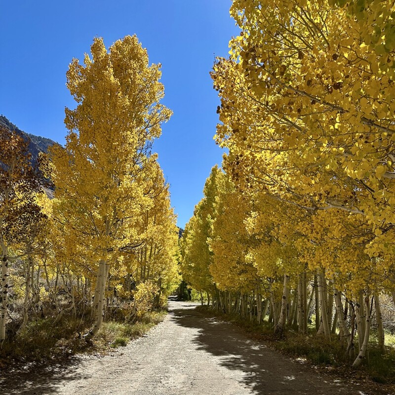 The Bishop area is one of those places where fall colors spread over a couple of months as they start up at the upper elevations (above 10,000’) and move down into the Owens Valley (roughly 4,000’). We have predominantly aspen trees in the high country and in the valley lots of cottonwoods and silver maples. Please visit our fall colors page for more information about where to see the fall colors around here. Pick your path!