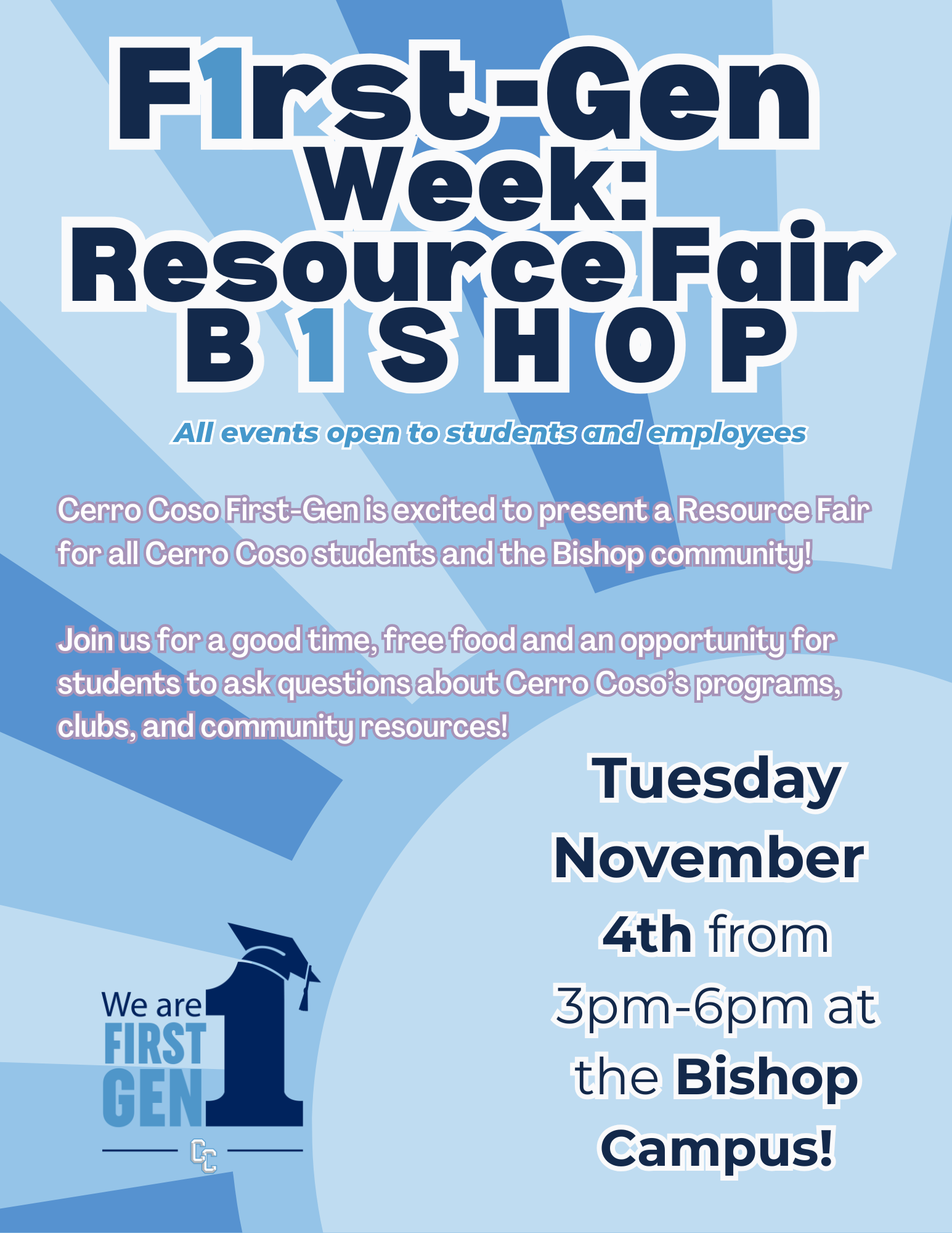 Celebrate Being First-Gen at Cerro Coso! Cerro Coso Community College First-Gen invites all students and community members to our First-Gen Resource Fair. |